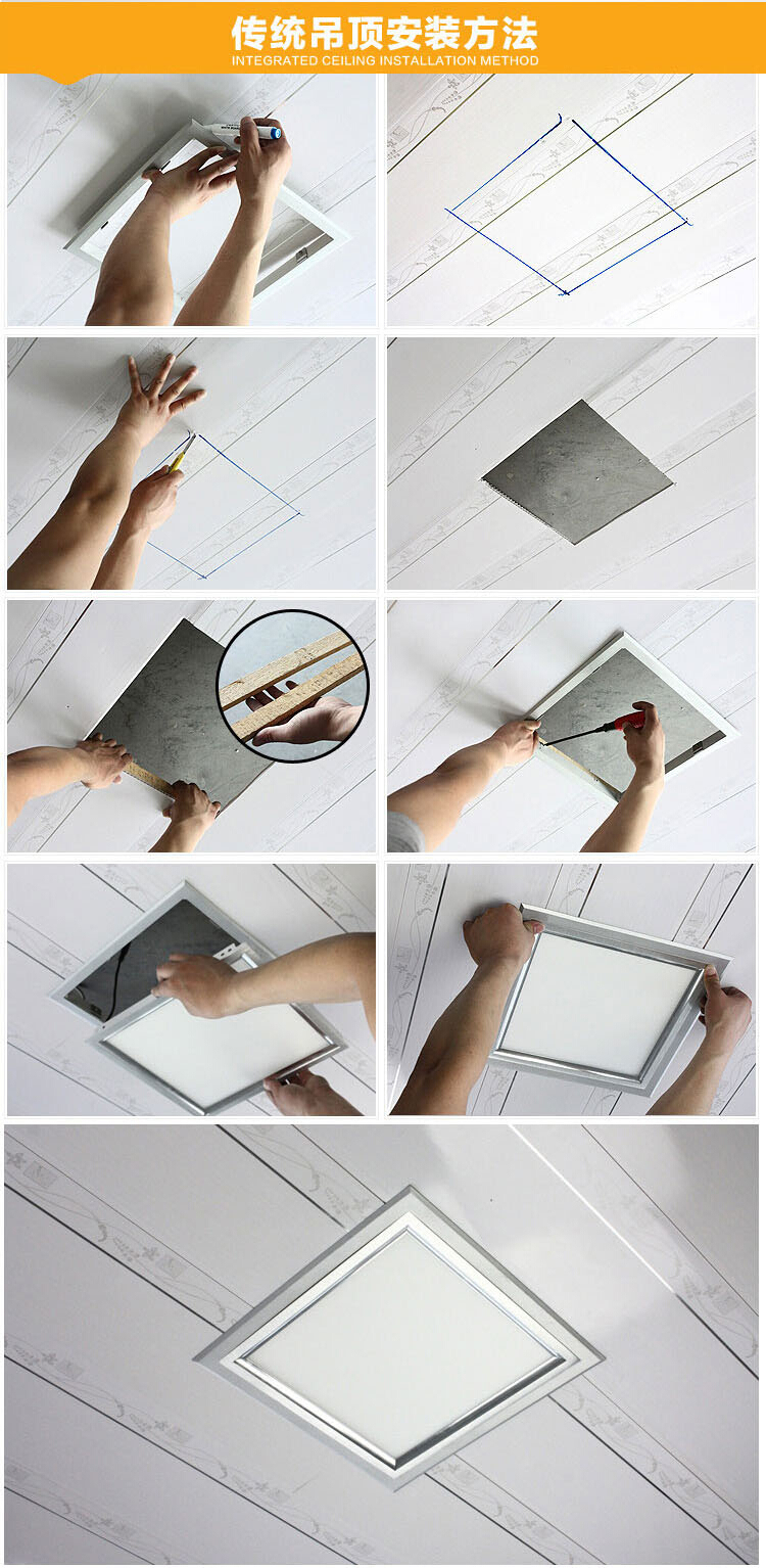 在塑料扣板、石膏板、木芯板吊頂安裝,我們只需輔助一個暗裝轉(zhuǎn)接框即可安裝,同樣十分方便,而且效果非常好看!