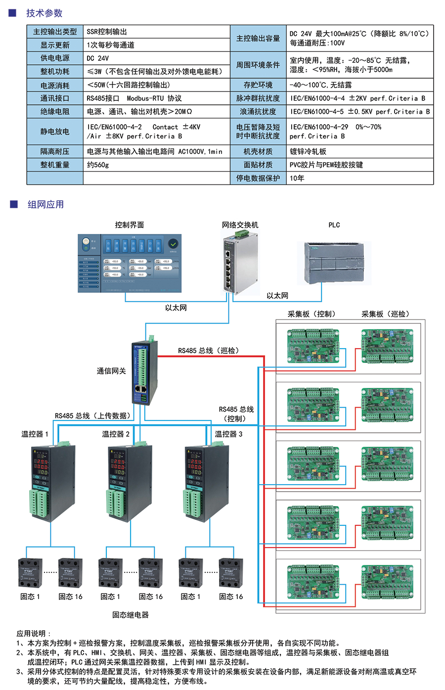 兩路RS485,一路上傳數(shù)據(jù)到PLC等上位機(jī),一路接采集板接收采樣溫度值