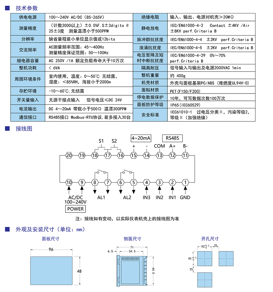 兩路開關(guān)量輸入(DI),可選兩路報(bào)警輸出,4~20mA變送輸出,RS485通信功能